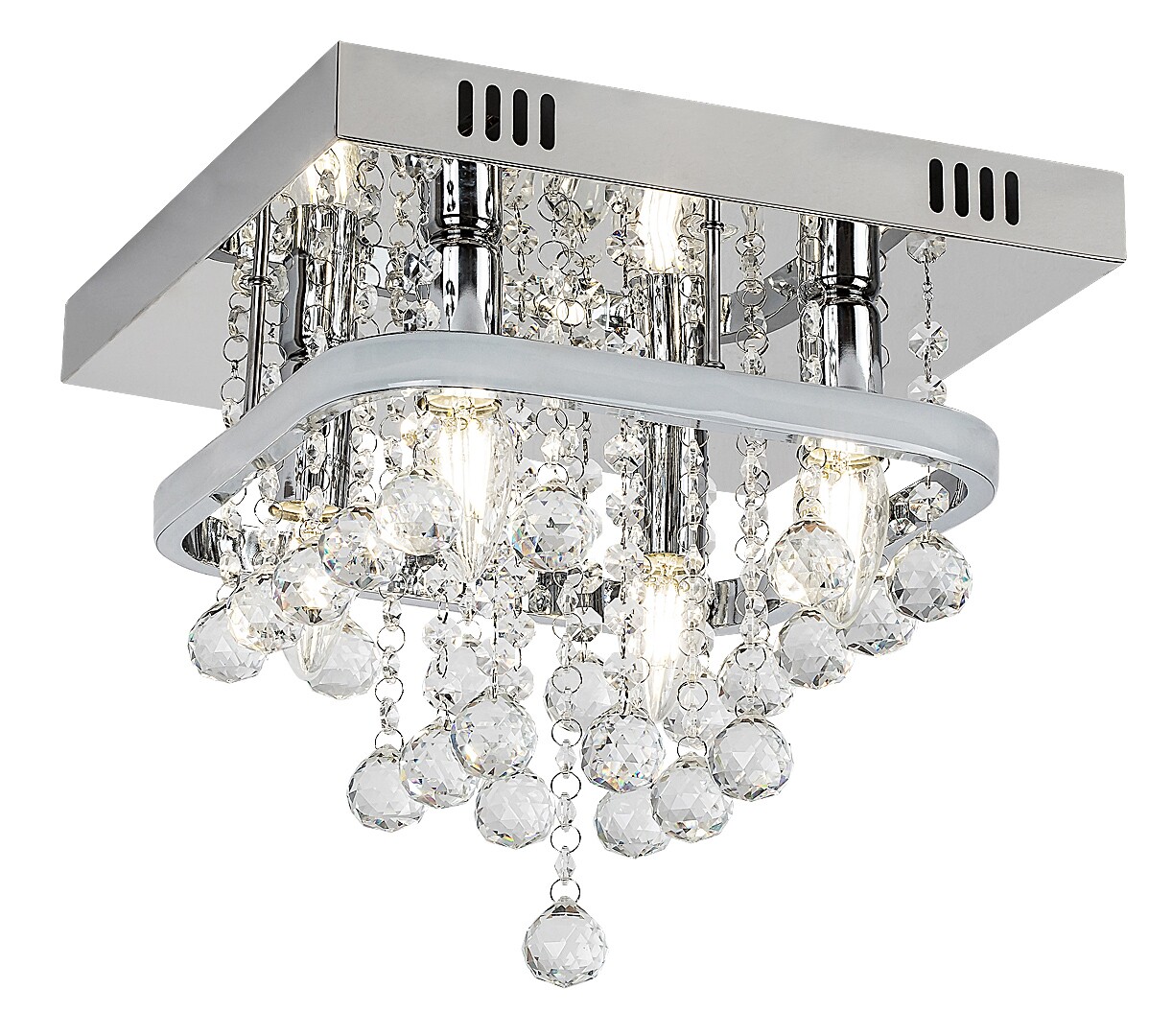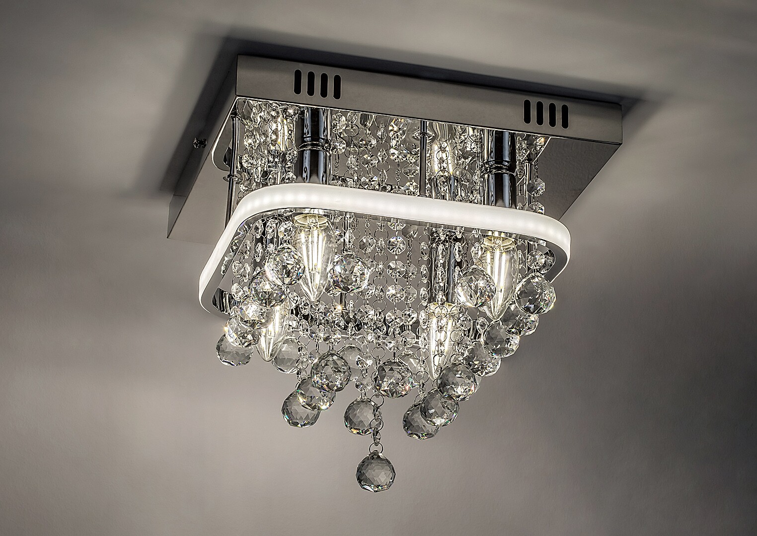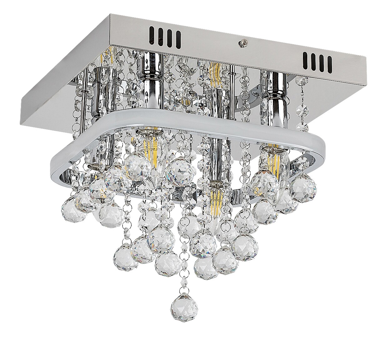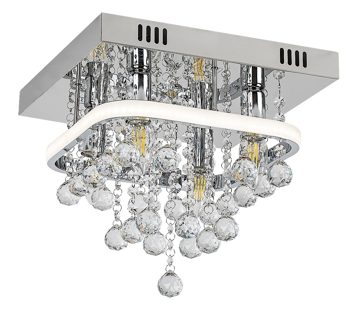 Kwadratowa lampa sufitowa Pallas w klasycznym stylu będzie wspaniałym dodatkiem do wyposażenia salonu, jadalni lub sypialni. Metalowa oprawa w kolorze chromu jest uzupełniona białym akrylowym abażurem, ale o wyglądzie tego żyrandola decydują przede wszystkim piękne kryształowe elementy dekoracyjne. Lampa Pallas ma wbudowane źródło światła LED o mocy 23 W, strumieniu świetlnym 1470 lumenów i trwałości 20 000 godzin. Źródło światła o temperaturze barwowej 4 000 K emituje naturalne białe światło. Lampa sufitowa może być ponadto używana z 4 żarówkami o mocy do 40 W każda. Typ oprawki to E14. Natężenie światła można regulować trójstopniowo za pomocą przełącznika ściennego. Piękna i elegancka lampa sufitowa, niezależnie od tego, gdzie ją umieścimy, z pewnością zapewni nastrojowe oświetlenie w pomieszczeniu. Wymiary lampy Pallas to 300x300mm, odległość od sufitu wynosi 285mm. Na ten model udzielamy 5-letniej gwarancji.