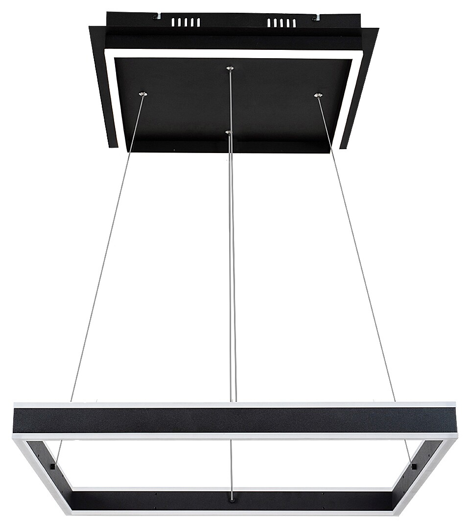 Lampa wisząca Quadro to wyjątkowo modny i stylowy element wyposażenia nowoczesnego salonu lub sypialni. Prostokątną, matowoczarną oprawę wykonaną z metalu uzupełnia biały abażur z tworzywa sztucznego oraz duża, kwadratowa, dekoracyjna podstawa. Lampa zawiera wbudowane źródło światła LED o mocy 60W, strumieniu świetlnym 1670 lumenów i temperaturze barwowej 4000K. Żarówka emitująca naturalne białe światło nadaje pomieszczeniu czysty, nowoczesny efekt. Wymiary Quadro są następujące: szerokość 600mm, wysokość 50mm, odległość od sufitu 1200mm, średnica instalacji 400mm. Na ten model udzielamy 5-letniej gwarancji.