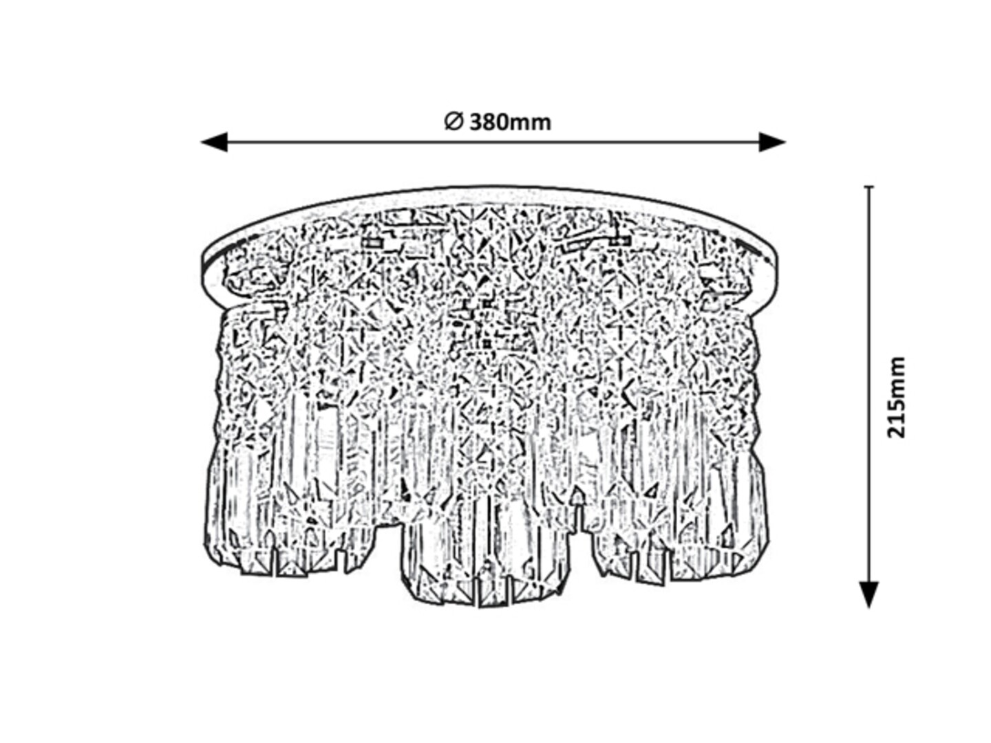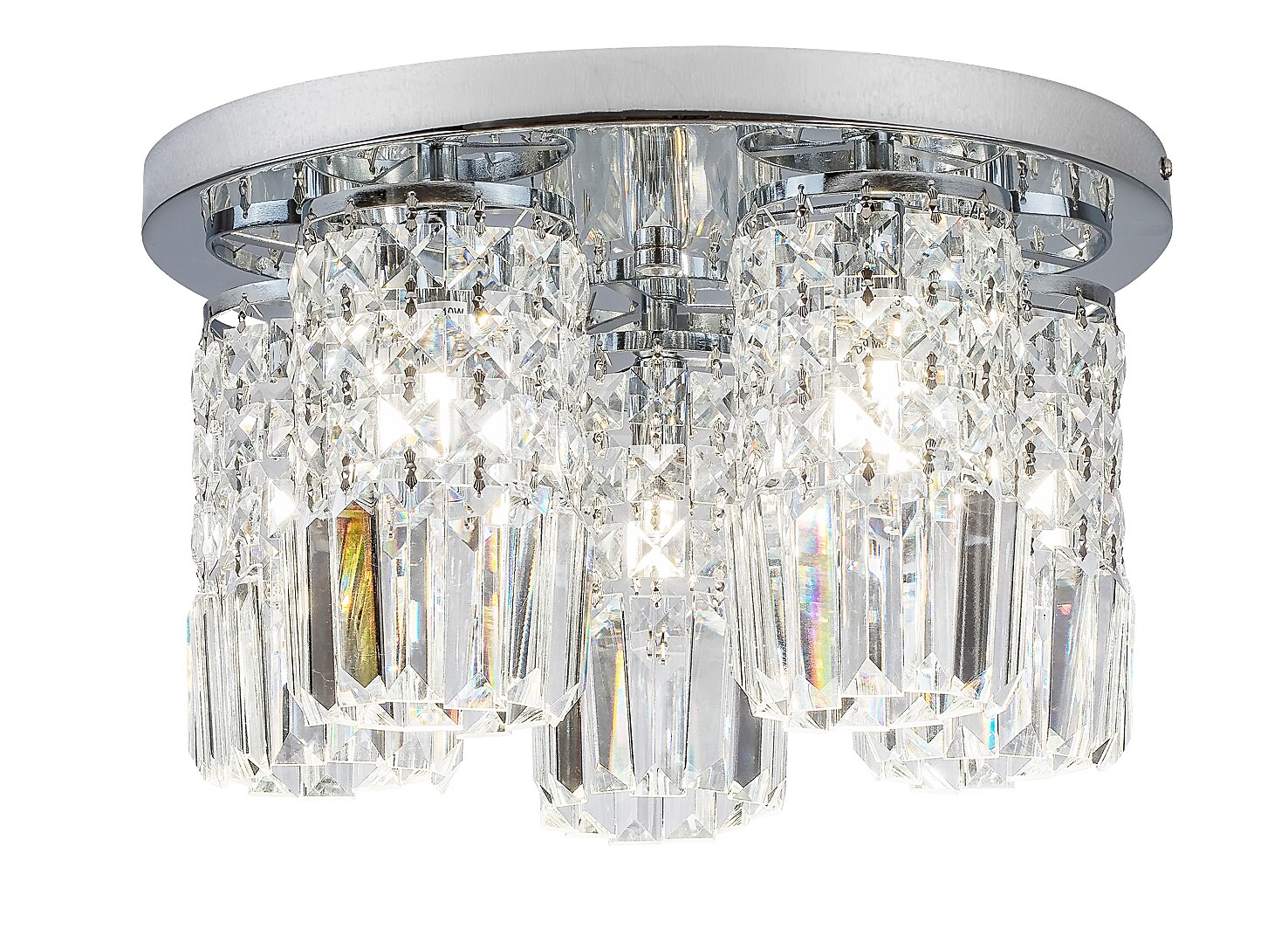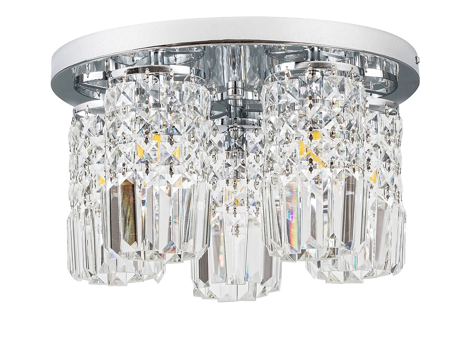 Reprezentująca styl klasyczny lampa sufitowa Rosanna będzie eleganckim dodatkiem do Twojego wnętrza. Uzupełnieniem metalowej oprawy w kolorze chromu jest klosz z przezroczystego szkła kryształowego. Lampę tą można przymocować do sufitu za pomocą dużej, okrągłej ozdobnej podstawy. Lampa sufitowa może współpracować z pięcioma żarówkami o mocy do 40W każda. Typ gniazd to G9. Jeśli chcesz podkreślić intymną, przytulną atmosferę, wybierz źródła emitujące ciepłe światło. Średnica tej lampy wynosi 380mm, a jej odległość od sufitu to 215mm. Ten model jest dostarczany bez źródeł światła.