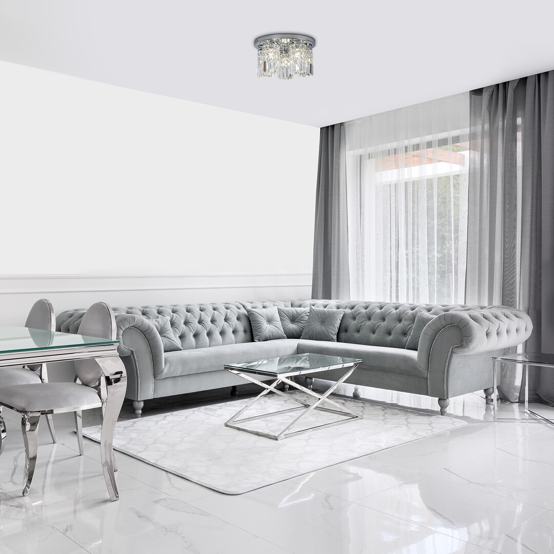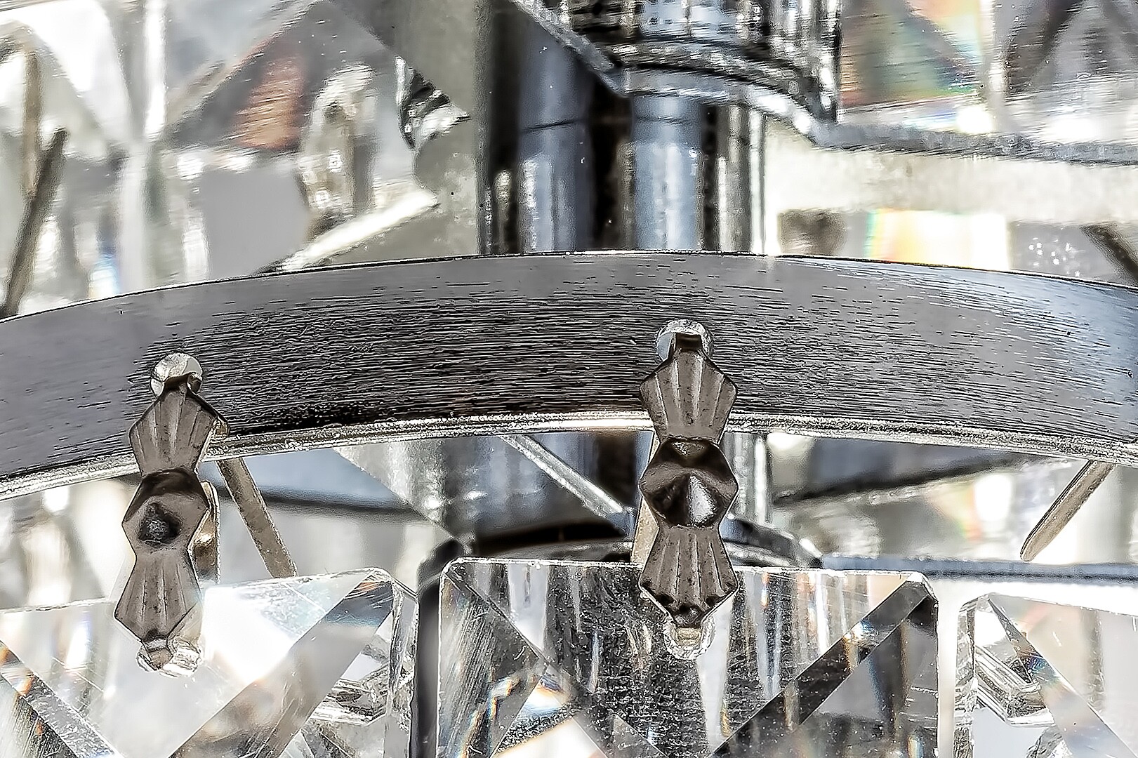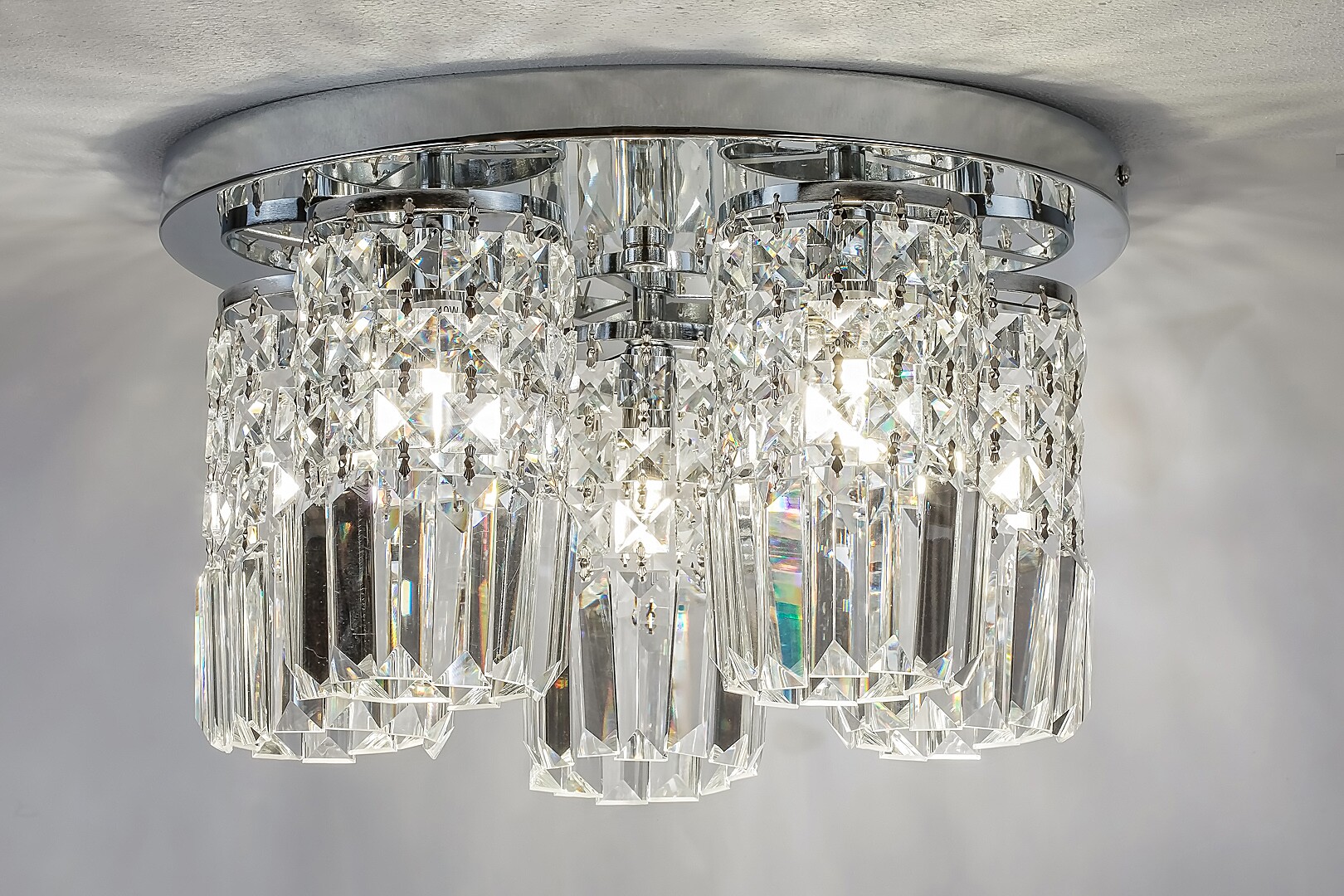 Reprezentująca styl klasyczny lampa sufitowa Rosanna będzie eleganckim dodatkiem do Twojego wnętrza. Uzupełnieniem metalowej oprawy w kolorze chromu jest klosz z przezroczystego szkła kryształowego. Lampę tą można przymocować do sufitu za pomocą dużej, okrągłej ozdobnej podstawy. Lampa sufitowa może współpracować z pięcioma żarówkami o mocy do 40W każda. Typ gniazd to G9. Jeśli chcesz podkreślić intymną, przytulną atmosferę, wybierz źródła emitujące ciepłe światło. Średnica tej lampy wynosi 380mm, a jej odległość od sufitu to 215mm. Ten model jest dostarczany bez źródeł światła.