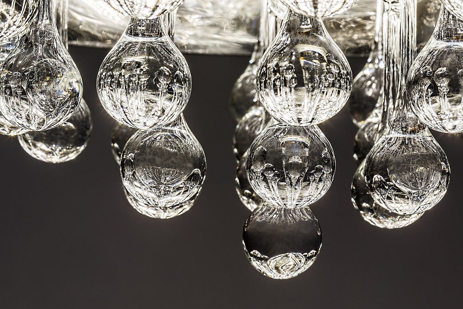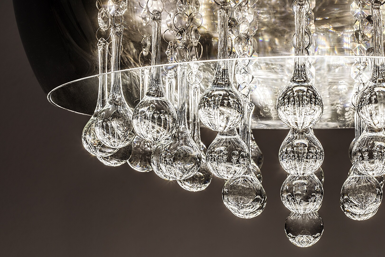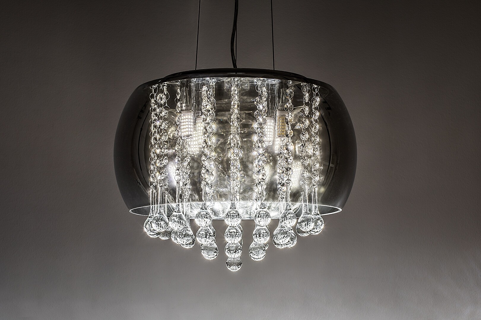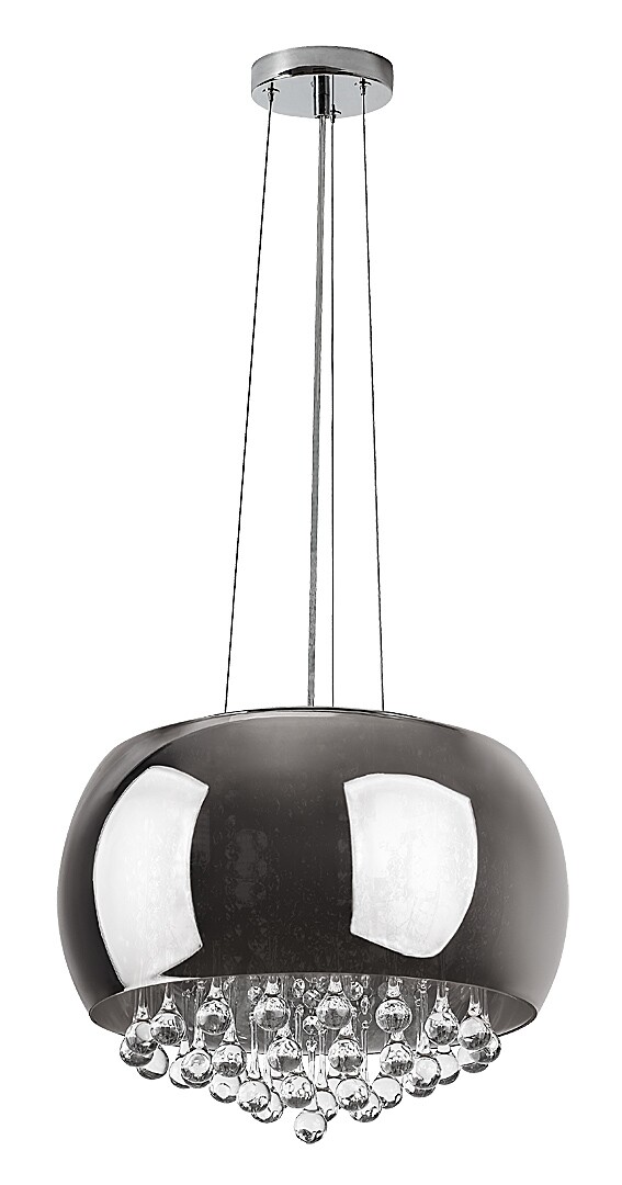 Lampa wisząca Ninelle reprezentująca styl nowoczesny polecana jest tym, którzy szukają do swojego salonu lub sypialni lśniącej, eleganckiej oprawy oświetlenia. Uzupełnieniem metalowej oprawy w kolorze chromu jest przyciemniany szklany klosz, którego część pokryta jest błyszczącą dekoracją ze szkła kryształowego. Lampa Ninelle jest wyjątkowa jak zawieszona na suficie biżuteria. Jest ona mocowana do sufitu za pomocą małej, okrągłej ozdobnej podstawy. Ten spektakularny model może być używany z sześcioma żarówkami o mocy do 40W każda. Typ gniazd to G9. W zależności od upodobań i efektu jaki chcesz uzyskać, możesz wybrać źródła emitujące naturalne lub ciepłe białe światło. Wymiary lampy wiszącej Ninelle są następujące: średnica jest równa 400mm, odległość od sufitu to 1400mm, natomiast średnica montażowa wynosi 120mm. Ten model jest dostarczany bez źródeł światła.