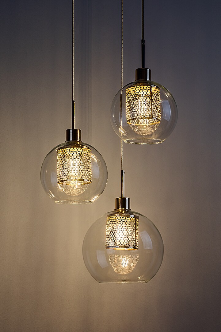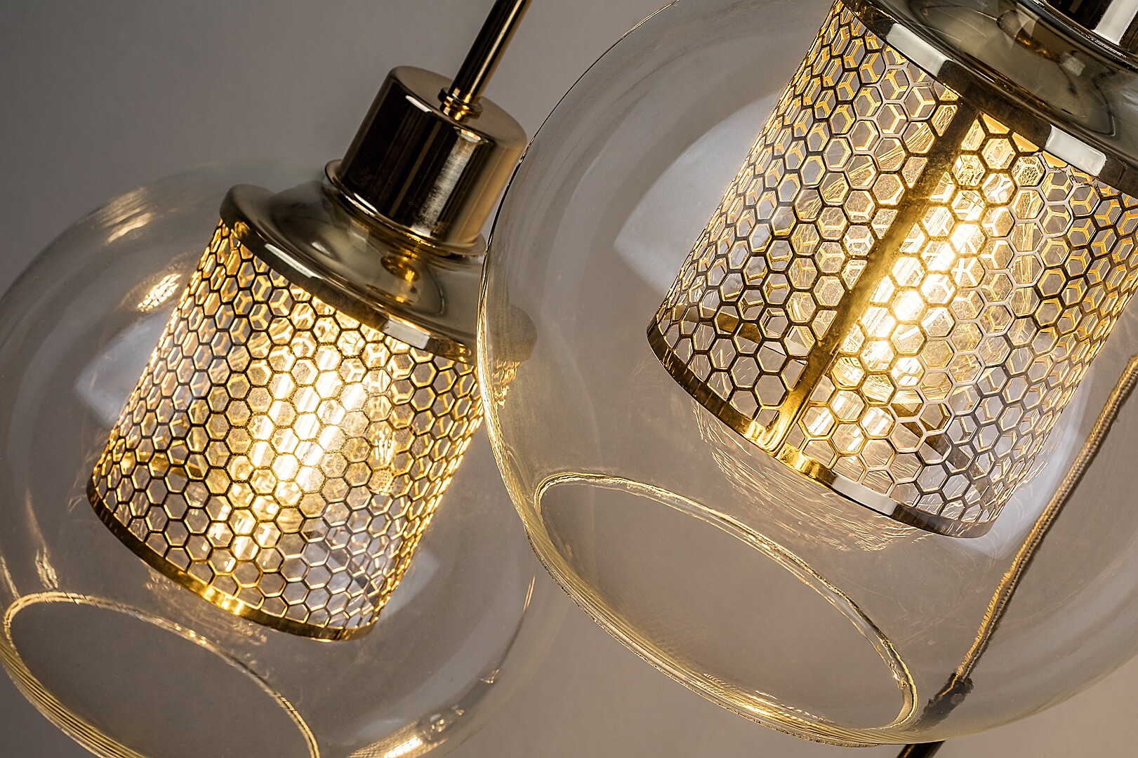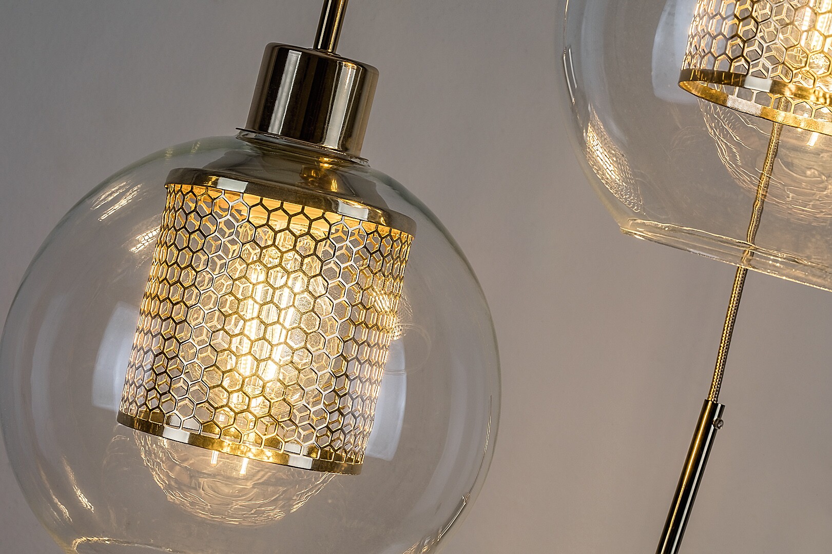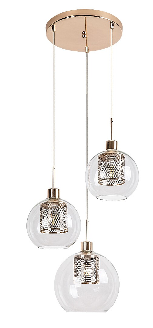 Dzięki swojej złotej barwie i spektakularnemu projektowi potrójny żyrandol Philana zyskuje sympatię tych osób, które lubią tradycyjne, podstawowe kształty, a jednocześnie cenią sobie spektakularne, nowoczesne rozwiązania. Cylindryczny element ze złotą kratą w kształcie plastra miodu skrywa w sobie źródło światła pod kulistym i otwartym w dolnej części kloszem z metalu. Do tej lampy z okrągłą dekoracyjną podstawą pasują trzy żarówki o mocy do 60 każda W i gnieździe typu E27. Ten żyrandol polecamy przede wszystkim do salonu. W zależności od efektu, który chcesz osiągnąć w danym pomieszczeniu, możesz wybrać dla niego źródło światła ciepłego lub naturalnego białego. Model Philana ma 450 mm średnicy, a jego odległość od sufitu wynosi 1200 mm. Jest on dostarczany bez żarówek.