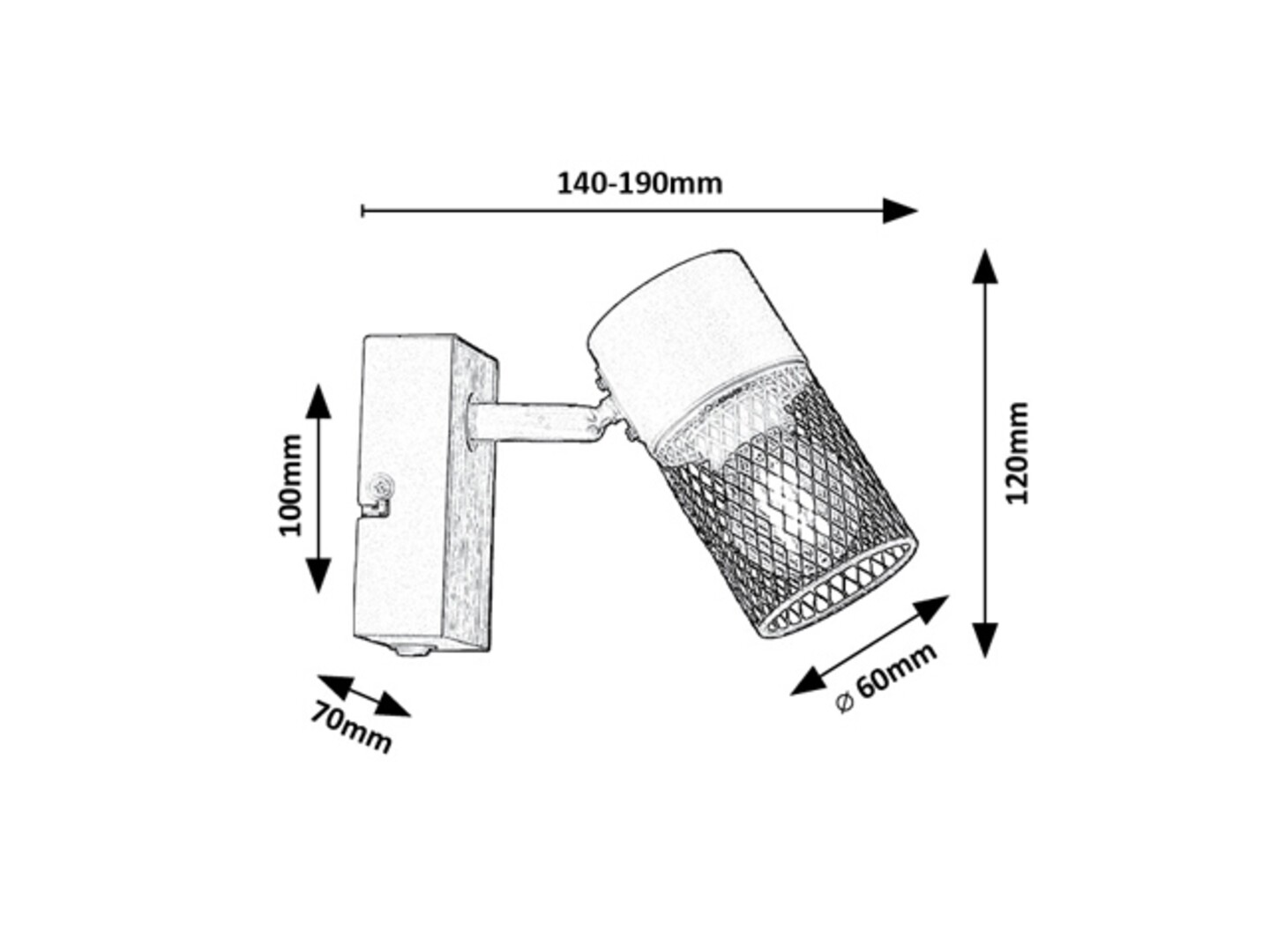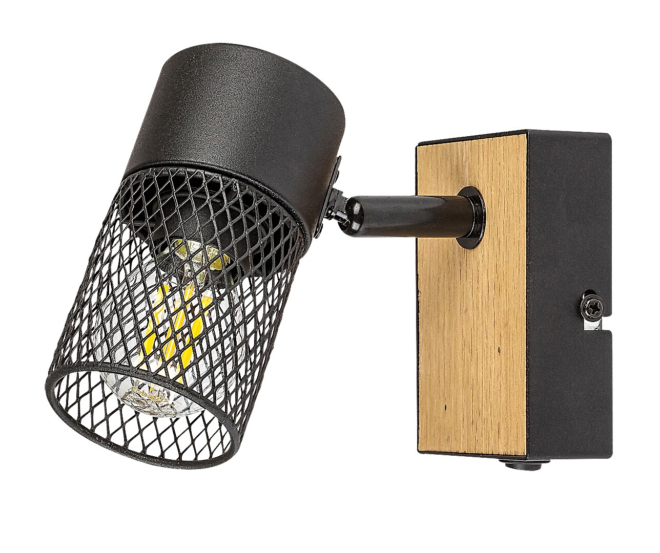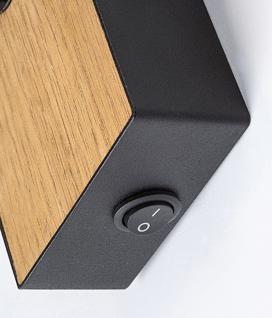 Utrzymana w stylu industrialnym pojedyncza ścienna oprawa punktowa Metta jest polecana przede wszystkim do salonu lub sypialni. Wykonana z metalu i drewna oprawa w kolorze dębu jest uzupełniona otwartym od dołu cylindrycznym kloszem ażurowym i może być przymocowana do ściany za pomocą pionowej prostokątnej podstawy dekoracyjnej. Dzięki ruchomej głowicy światło może być ukierunkowane w dowolny sposób według upodobań. Do oprawy Metta można zastosować źródło światła z trzonkiem E14 o mocy max. 40 W. W zależności od upodobań i miejsca montażu można użyć źródło światła o barwie ciepłobiałej lub naturalnie białej. W sypialni zaleca się stosowanie źródła światła o barwie ciepłobiałej, które pomoże stworzyć przytulną, domową atmosferę. Efekt ten jest wzmocniony za pomocą gęstego, abażurowego klosza, który deliketnie filtruje światło emitowane przez źródło światła. Wymiary pojedynczej oprawy Metta z przełącznikiem są następujące: wysokość 120 mm, średnica 60 mm, odległość od ściany 140 mm. Model ten jest dostarczany bez źródła światła.
