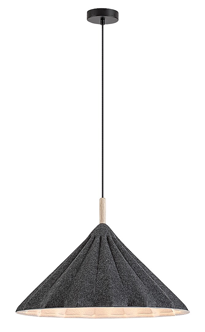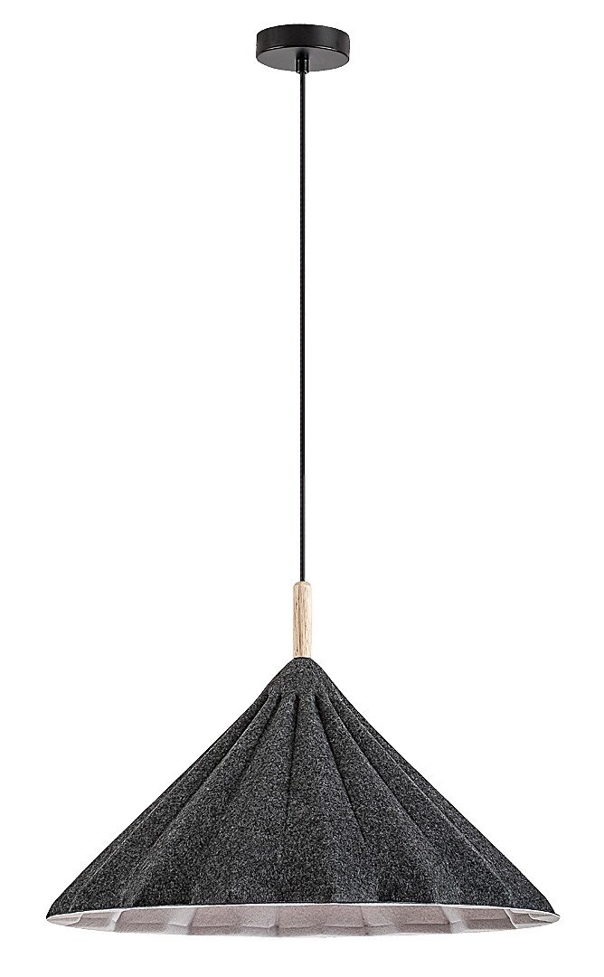 Lampa wisząca Rabalux Linavo jest polecana dla osób, które cenią ekologiczne rozwiązania. Ten model wykonany jest w kolorze czarnym z metalowym korpusem i szarym kloszem z filcu. Użyty filc jest wykonany z przyjaznego dla środowiska materiału pochodzącego z recyklingu. Klosz ma trójkątny kształt i falowaną powierzchnię. Dzięki dużej średnicy i otwartemu dołowi, żarówka emituje światło pod szerokim kątem. Lampa wisząca może być zamontowana na suficie za pomocą małej, okrągłej, dekoracyjnej podstawy i może być używana z jednym źródłem światła o mocy do 40 W. Typ gniazda to E27. W zależności od preferencji, można wybrać źródło światła emitujące ciepłe lub naturalne białe światło. Lampa jest idealnym wyborem do salonu, sypialni lub pracowni. Dostarczana jest bez źródła światła.
