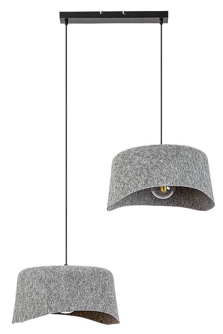 Lampa wisząca Rabalux Farelia z dwoma żarówkami jest polecana dla osób, które lubią modele wyjątkowe zarówno pod względem kształtu, jak i materiału. Lampa wisząca z dwoma kloszami jest wykonana z czarnego metalu z szarymi kloszami z filcu i może być zamontowana na suficie za pomocą wydłużonej, kwadratowej dekoracyjnej podstawy. Materiał filcowy kloszy jest wykonany z przyjaznego dla środowiska materiału pochodzącego z recyklingu. Dwa klosze wiszą na różnych wysokościach, co w połączeniu z falistymi liniami kloszy dodaje lampie figlarności, a materiał kloszy nadaje jej ciepłego wyglądu. Lampa wisząca z dwoma żarówkami jest idealna do nowoczesnych salonów, sypialni lub pracowni. Może być używana z dwoma źródłami światła, każde o mocy do 10 W. Typ gniazda to E27. Lampa jest dostarczana bez źródeł światła.