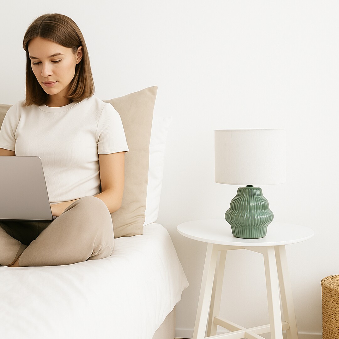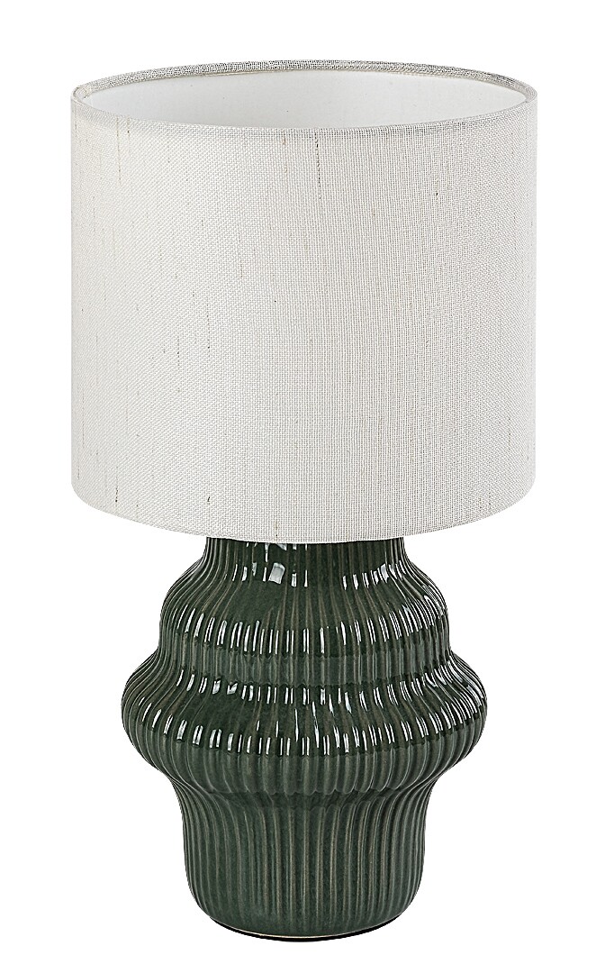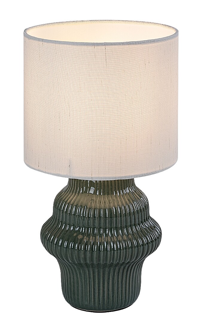 Lampa stołowa Rabalux Glimo to idealny wybór dla osób, które przy wyborze lampy kierują się zarówno funkcjonalnością, jak i estetyką. Model ten polecany jest do sypialni, salonu oraz gabinetu. Można ją ustawić na stole, biurku lub stoliku nocnym. Oprawa posiada ciekawy żłobiony wzór oraz rozszerzający się kształt w środkowej części. Wykonana jest z zielonej ceramiki, natomiast abażur z białej tkaniny. Abażur ma cylindryczny kształt i jest otwarty u góry i u dołu. Jasna kolorystyka klosza pozwala na przenikanie dużej ilości światła, dzięki czemu lampa może być używana również jako lampka do czytania. Lampka nocna przystosowana jest do jednej żarówki o mocy do 40 W. Typ trzonka: E14. Wyposażona jest w wyłącznik na kablu. Dostarczana jest bez źródła światła.