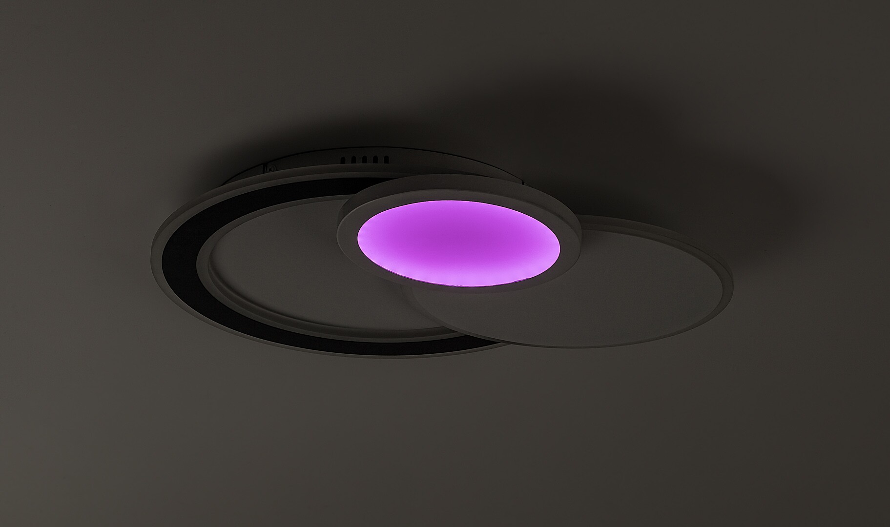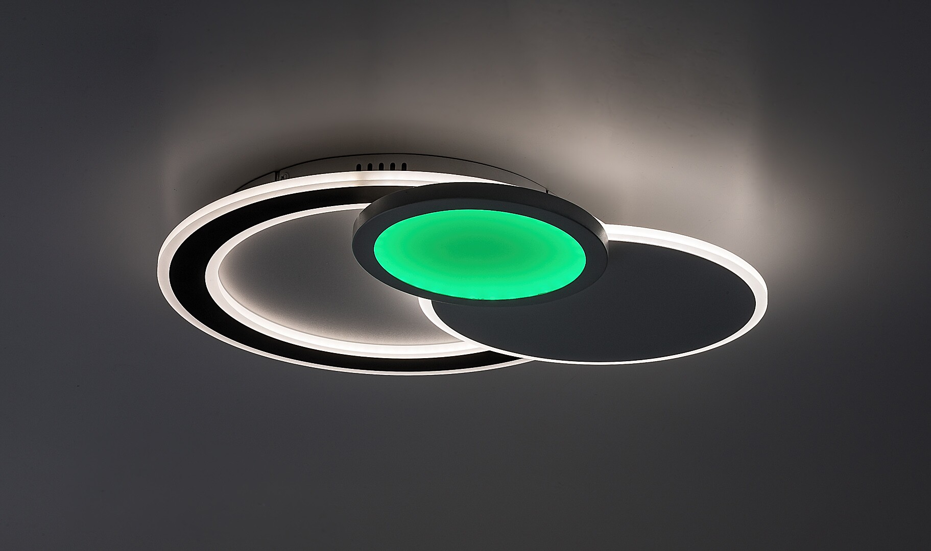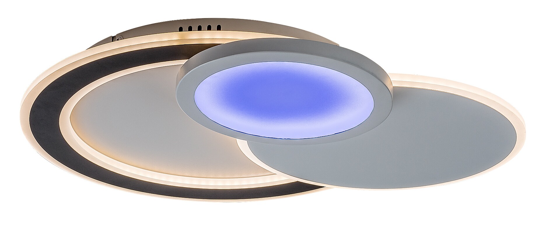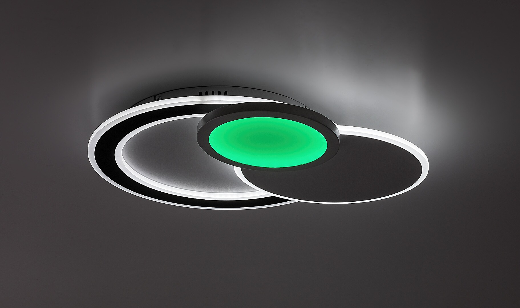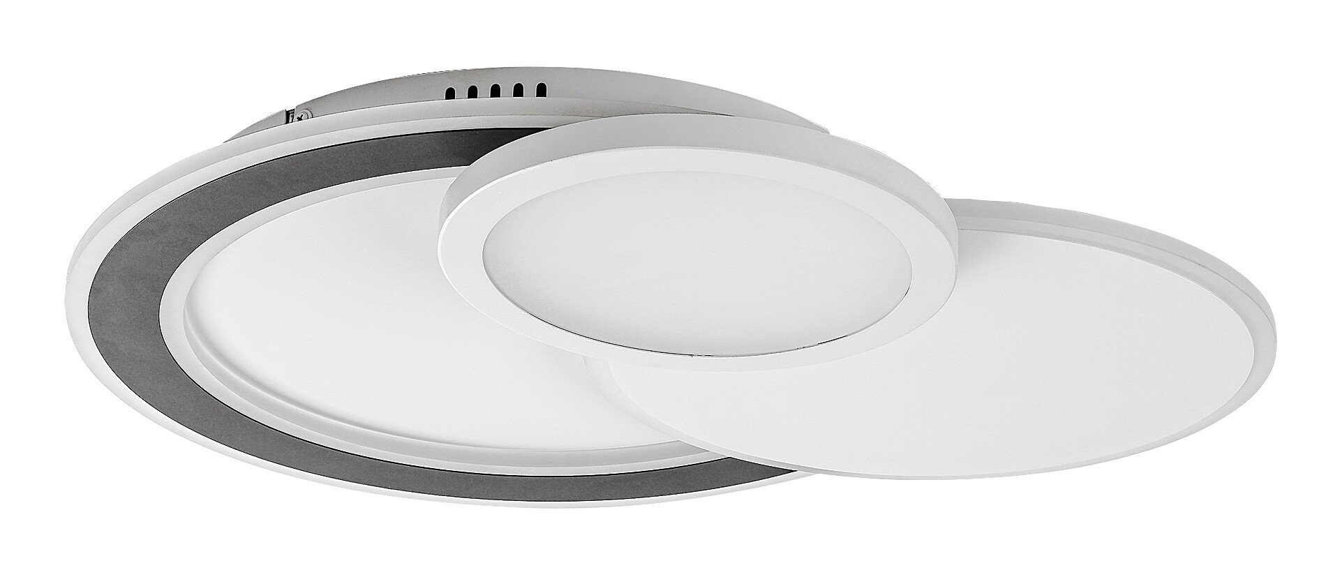 Lampa sufitowa Rábalux Stavros jest polecana tym, którzy cenią sobie zarówno kreatywny design, jak i inteligentne funkcje. Lampa LED wykonana jest z metalu w kolorze czarnym i posiada biały klosz z tworzywa sztucznego. Składa się z trzech częściowo zachodzących na siebie okrągłych elementów o różnych rozmiarach. Lampa posiada wbudowane źródło światła LED, które gwarantuje energooszczędne działanie i długą żywotność. Temperaturę barwową światła można regulować za pomocą pilota lub włącznika ściennego. Dostępne jest również oświetlenie RGB, które znajduje się na powierzchni najmniejszego, centralnego elementu lampy. Jasność światła można regulować, a funkcja pamięci umożliwia zapamiętanie ustawień – obie funkcje obsługiwane są za pomocą pilota. Intensywność światła lampy pozwala na skuteczne oświetlenie większego pomieszczenia. To idealny wybór do salonu, jadalni lub sypialni.