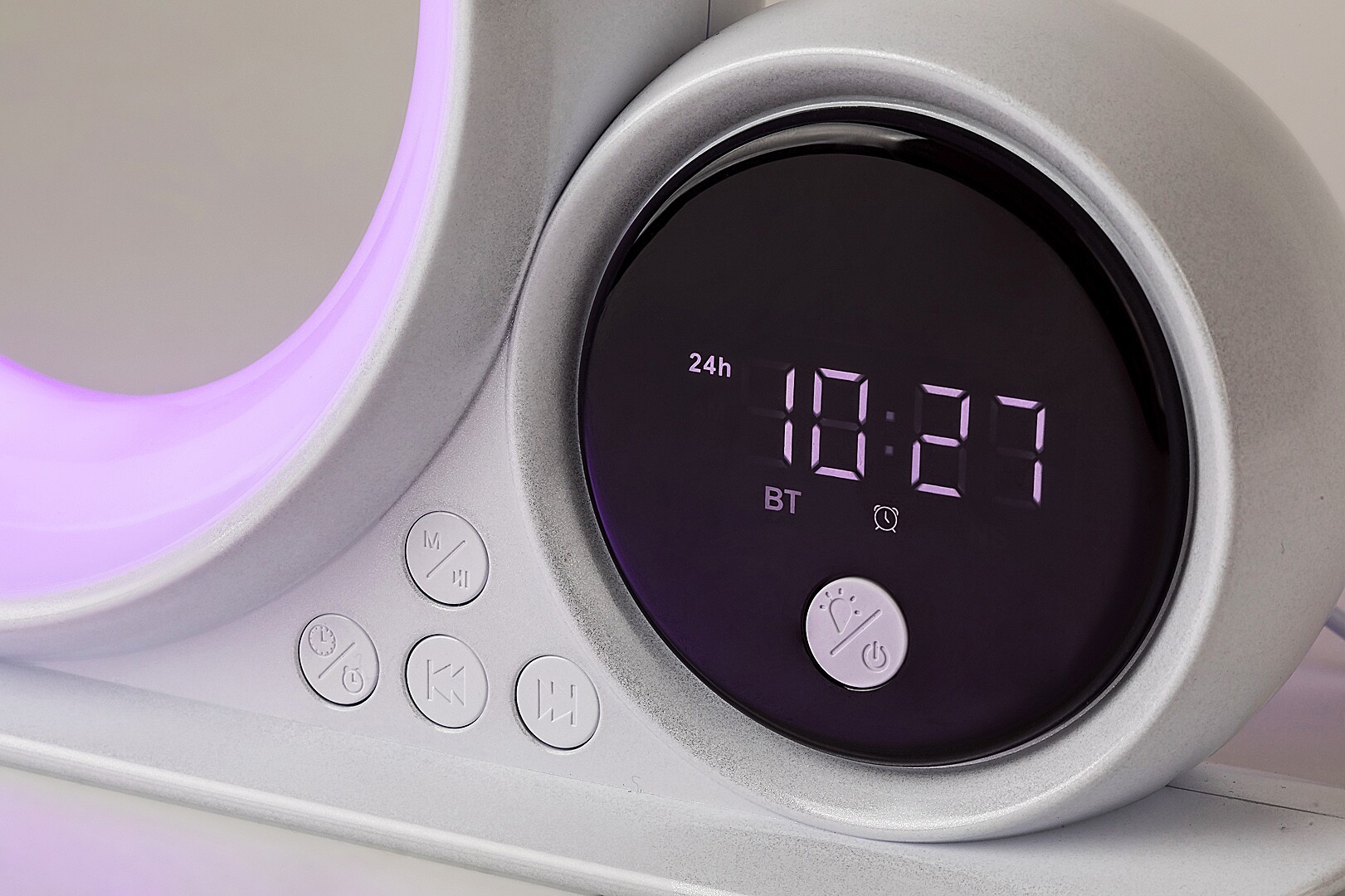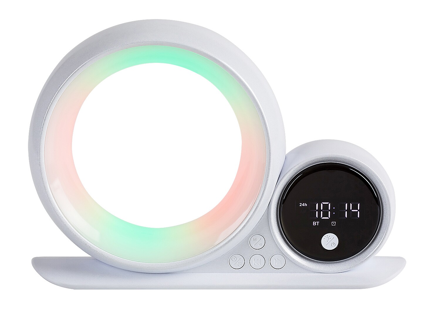Lampa stołowa Rabalux Wakeway jest polecana dla osób, które szukają dekoracyjnej lampy uzupełniającej, łączącej wiele funkcji. Istotą tego modelu są dwa okrągłe elementy lampy o różnych rozmiarach, trzymane przez wydłużoną, płaską dekoracyjną podstawę. Mniejszy element jest wyposażony w wyświetlacz pokazujący godzinę oraz wbudowany głośnik Bluetooth, podczas gdy większy element pełni funkcję lampy. Impedancja głośnika wynosi 4 Ω, moc: 3 W. Lampa stołowa emituje światło z wewnętrznej połowy pierścieniowego korpusu. Ten model oferuje oświetlenie RGB, zapewniając niezwykle nastrojowe, wielokolorowe rozwiązanie świetlne. Lampa designerska jest idealnym wyborem do salonu, sypialni lub pracowni. W zestawie znajduje się kabel oraz wbudowane źródło światła LED, które zapewnia długą żywotność.